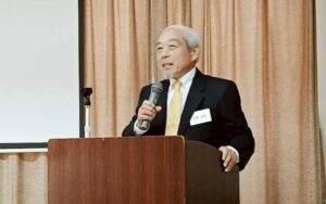 会場となった中央電気俱楽部は、大正3年(1914年)に電気関係者により設立された、由緒ある社交倶楽部です。冒頭の挨拶で、加藤道彦会長(高18)は同倶楽部が「松下幸之助氏が有名な『水道哲学』を表明した場所」であることを紹介されました。この建物を目当てに参加された方もおり、倶楽部内部に入れたこと自体が貴重な体験となりました。