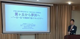 70周年という節目の年となった今年度の定期総会・懇親会のテーマは、“次の世代へつなげる”こと。恒例の同窓生による講演では、若手代表として西垣内渉さん(高53)が登壇し、「薫が丘から夢洲へ ~”一日一生”の精神で紡ぐキャリア~」と題して講演されました。東京大学卒業後、関西の読売テレビ局員を経て、大阪・四條畷市マーケティング監としての経験、そして現職で大阪・関西万博の広報に携わるまでの歩みを丁寧に語ってくださいました。