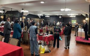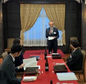 講演会の後は、国会議事堂の赤じゅうたんを思わせるレトロな館内を移動し、食堂で懇親会が行われました。乾杯に続き、来賓の同窓会事務局長 岩崎靖さんより「同窓会資料に綴られる関西同窓会の歴史」について紹介がありました。支部会便りで最も古いのは、第4号(昭和5年)に京大生が開いた「京都伊那中会」の記事だったとのことで、記録を残す大切さをあらためて感じるひとときとなりました。